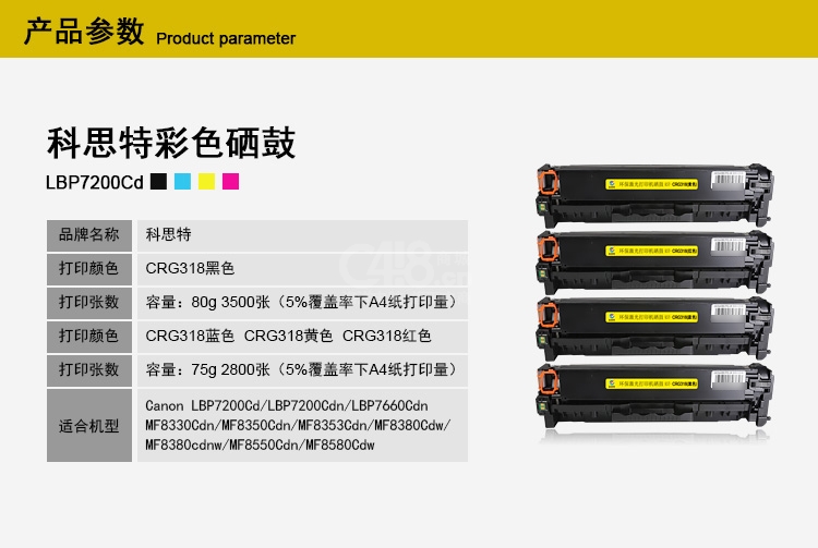 | 適用機(jī)型 | Canon LBP 7200/7600/7660/7680/MF 8330/8340/8350/8360/8380/8580Cdw/8570/8550/8530/726Cdw/722Cdw/729Cdw/724Cdw/728Cdw/729Cx/727Cdw/725Cdn |