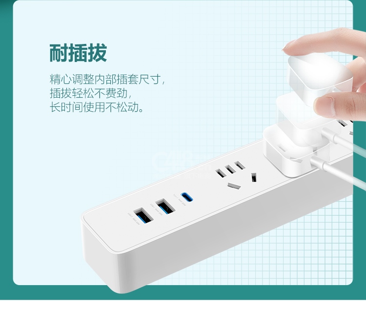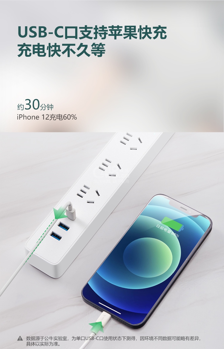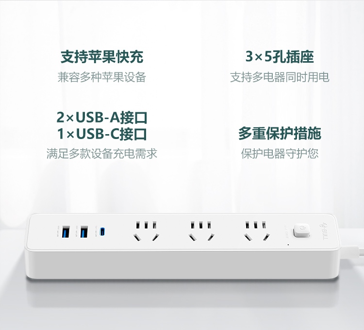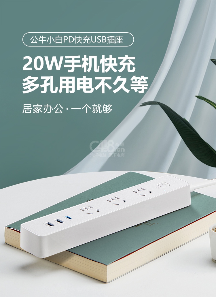 “BULL/公牛”GNV-UU4203 延長線插座 單個裝(白色20W PD蘋果快充插線板/插排/接線板Type-c口+USB口+3插孔全長1.8米)