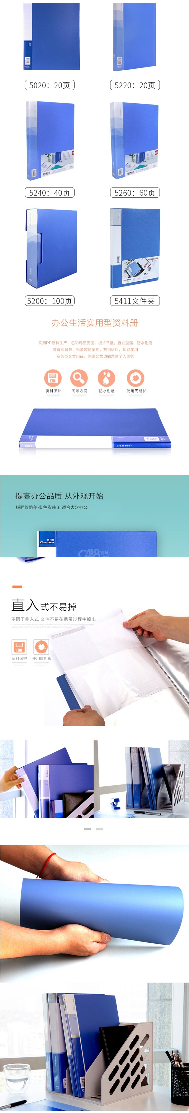 “deli/得力”No.5260 資料冊 單本裝(藍(lán)色A4文件夾資料夾插頁夾辦公收納學(xué)生試卷分類透明插頁60頁)
