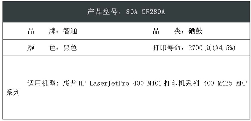 “ZT(kilter)/智通”80A CF280A 環(huán)保型激光碳粉盒 單個裝(黑色硒鼓帶芯片ZT-CF280A適用HP LaserJetPro 400 M401打印機(jī)系列400 M425 MFP系列)