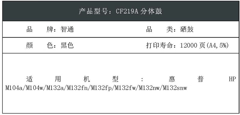 “ZT(kilter)/智通”CF219A 分體鼓 單個裝(黑色ZT-CF219A-FD成像鼓帶芯片適用于惠普HP M104a/M104w/M132a/M132fn/M132fp/M132fw/M132nw/M132snw)