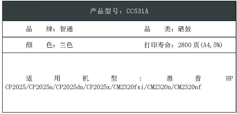 “ZT(kilter)/智通”CC531A 環(huán)保型激光碳粉盒 單個(gè)裝(藍(lán)色硒鼓帶芯片ZT-CC531A-C適用惠普HP CP2025/CP2025n/CP2025dn/CP2025x/CM2320)