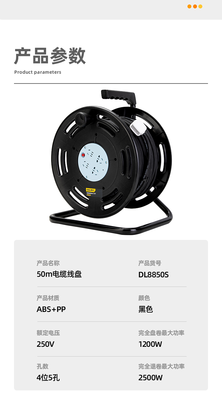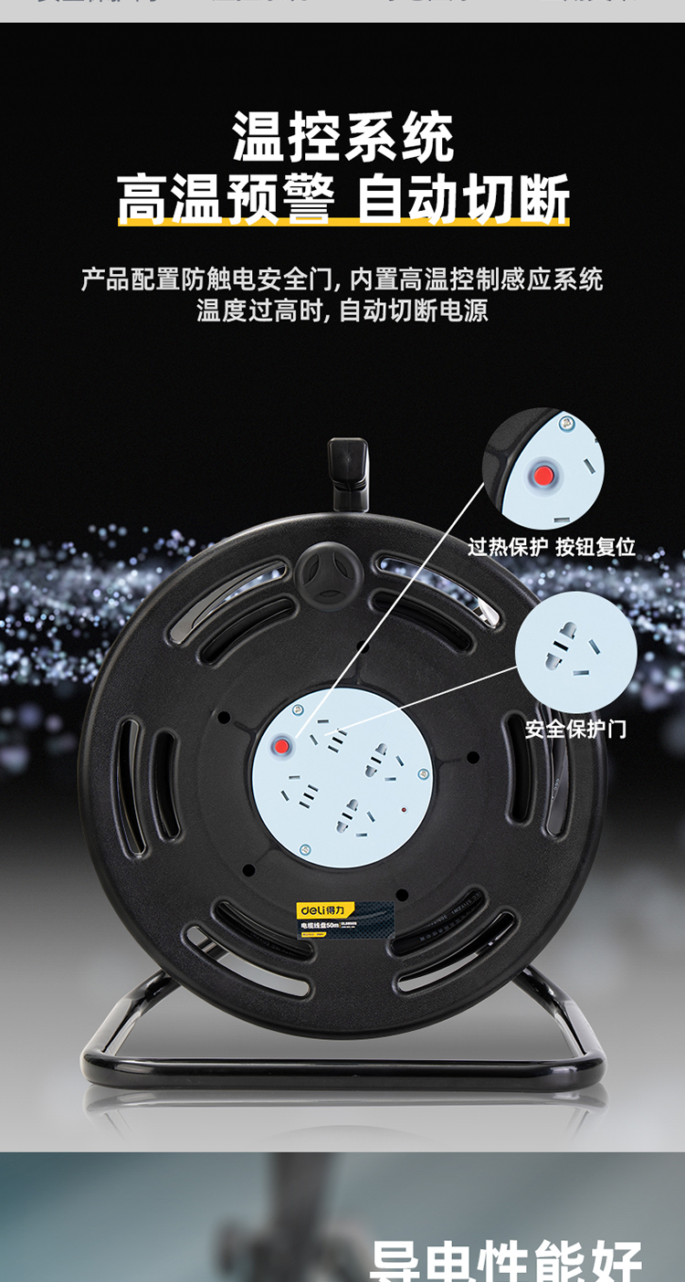 “deli/得力”DL8850S 電纜線盤 單個裝(4位50m/1.5線徑過熱保護工程接線盤移動電纜盤電線盤拖線盤卷線盤插座50米)