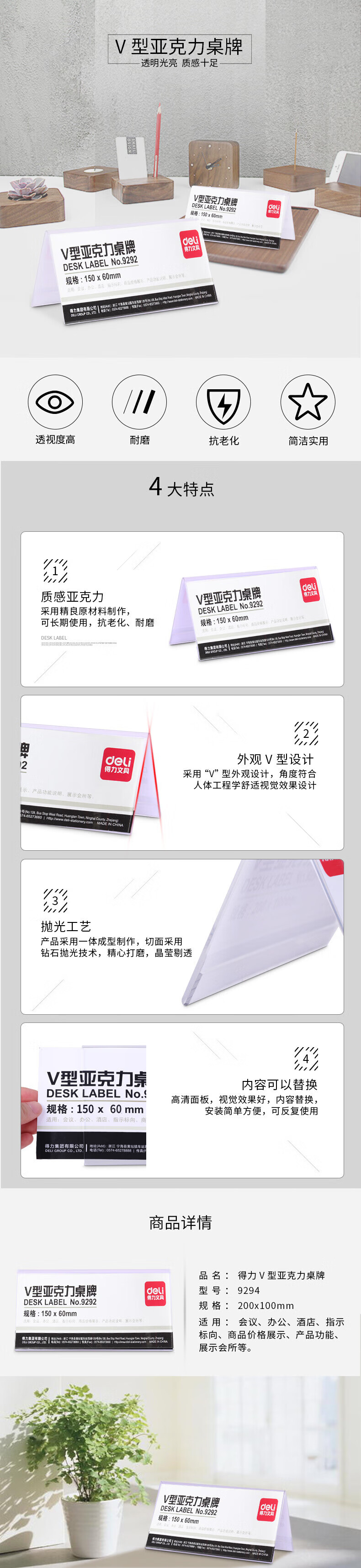 “deli/得力”No.9292 V型亞克力桌牌 單只裝(透明150*60mm會(huì)議牌架展示牌臺(tái)卡標(biāo)簽臺(tái)廣告牌5只/包)