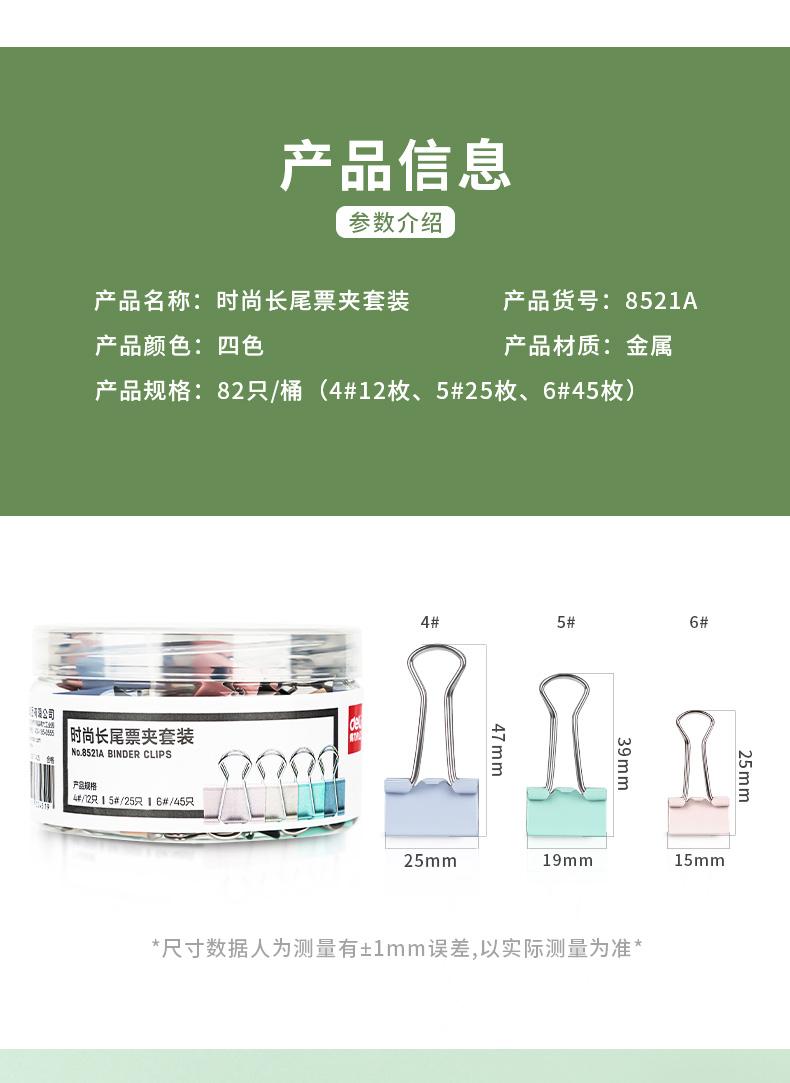 得力8521A時(shí)尚長尾票夾套裝(混)(筒)*1