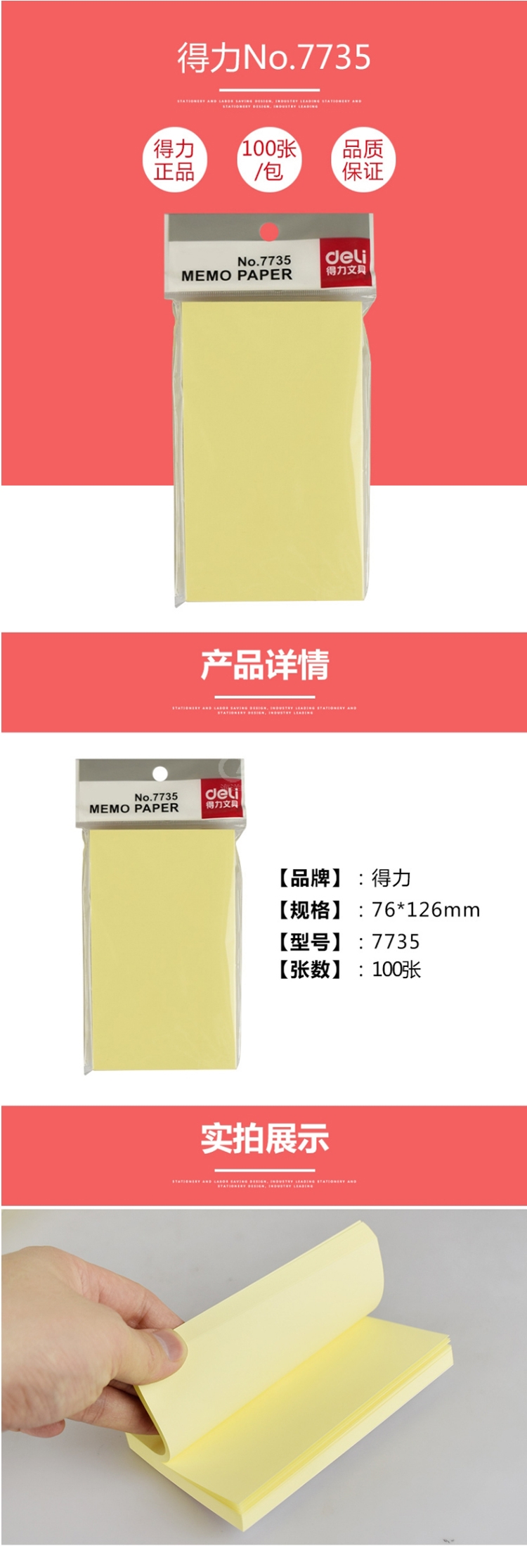“deli/得力”No.7735 百事貼 單卡裝(淡黃76*126mm記事貼便利貼標簽紙便簽紙強黏性可反復粘撕100張/卡12卡/盒)