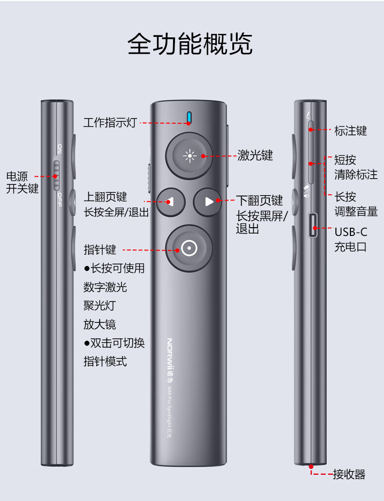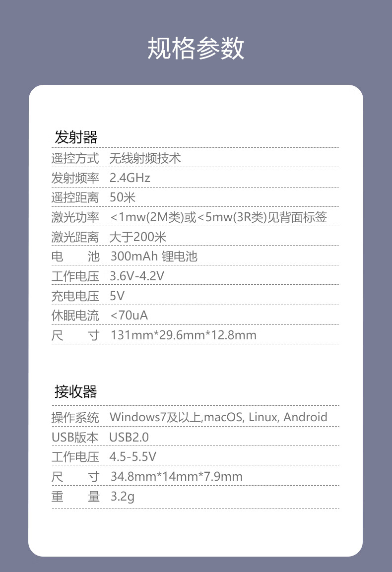 產(chǎn)品主體*1、接收器*1、USB充電線*1、絨布袋*1、保修卡*1、包裝盒*1