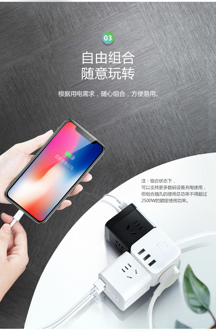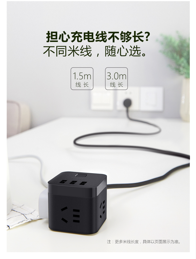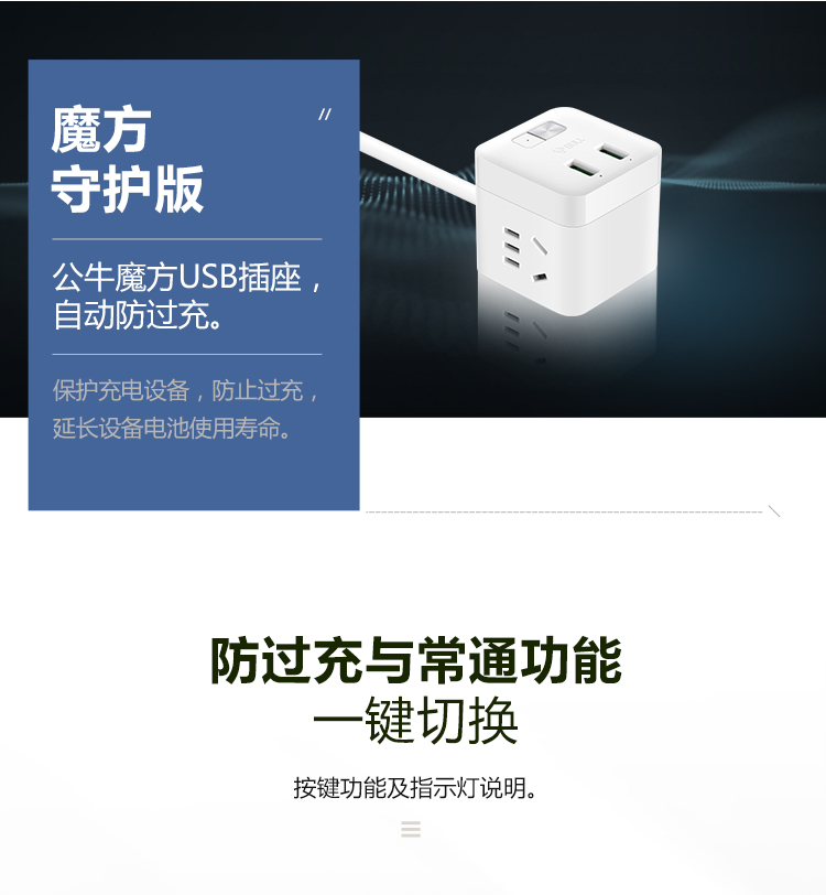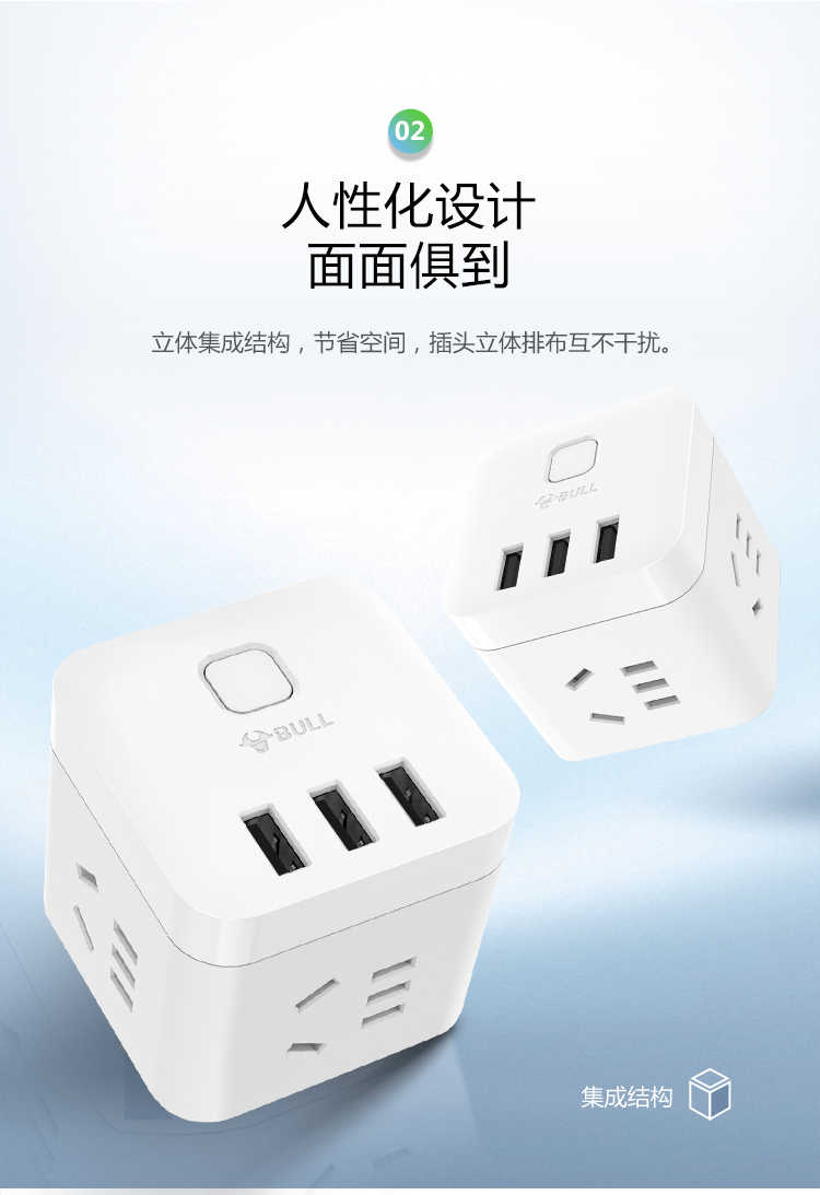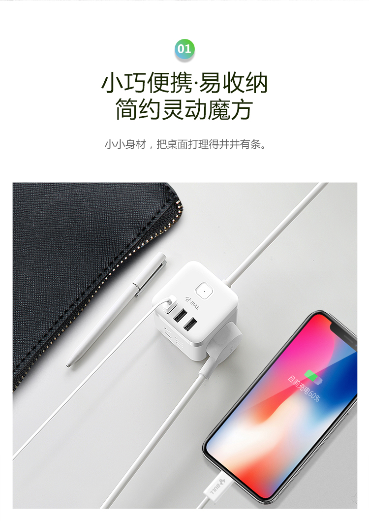 “BULL/公?!盙NV-UUB122 USB魔方插座 單個(gè)裝(白色2孔+2USB口全長(zhǎng)1.5米插線板/插排/排插/接線板)