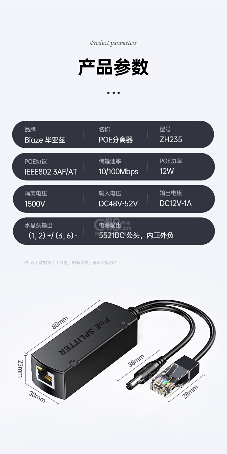 畢亞茲 POE分離器48V轉(zhuǎn)12V標(biāo)準(zhǔn)帶隔離 ZH235*1個