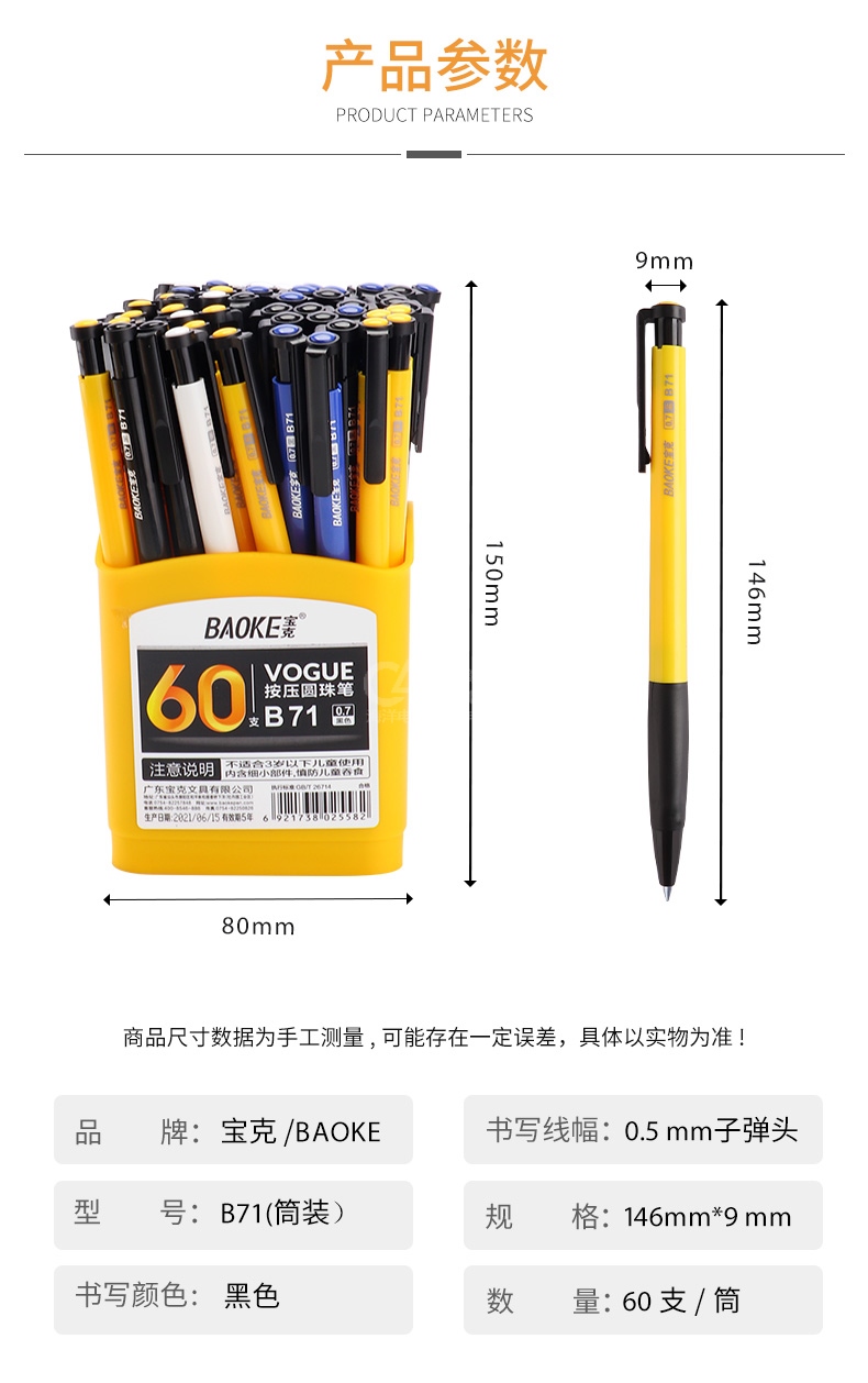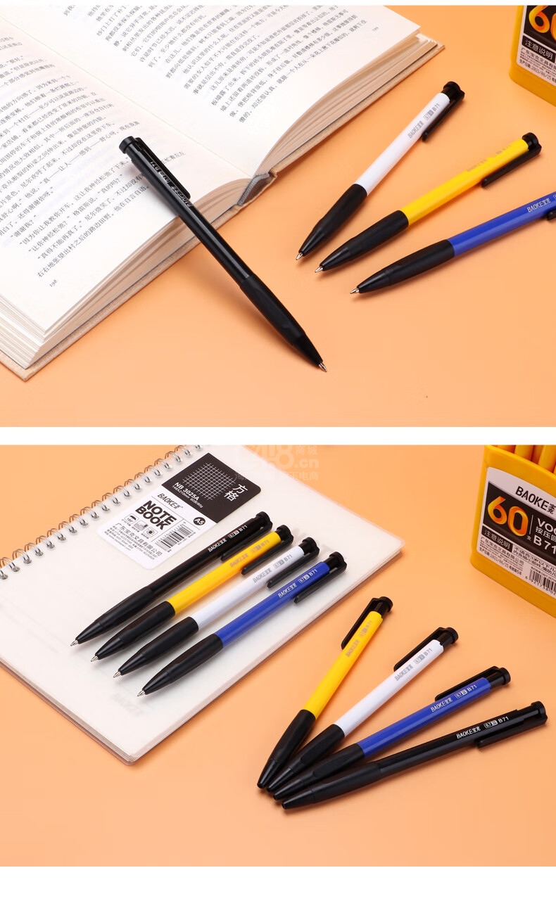 “BAOKE/寶克”B71 按壓圓珠筆 單支裝(黑色0.7mm按動(dòng)圓珠筆中油筆原子筆軟膠握手60支/筒)