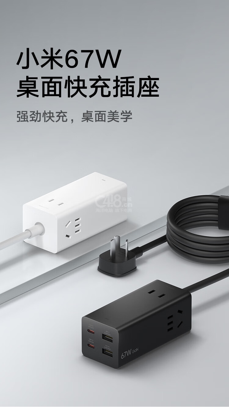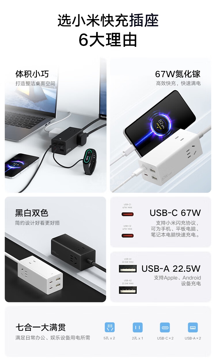 “MI(XIAOMI)/小米”XMCDZ-02QM 桌面快充插座 單個裝(白色氮化鎵67W充電器快充筆記本多功能USB插線板接線板2C2A+3插孔)
