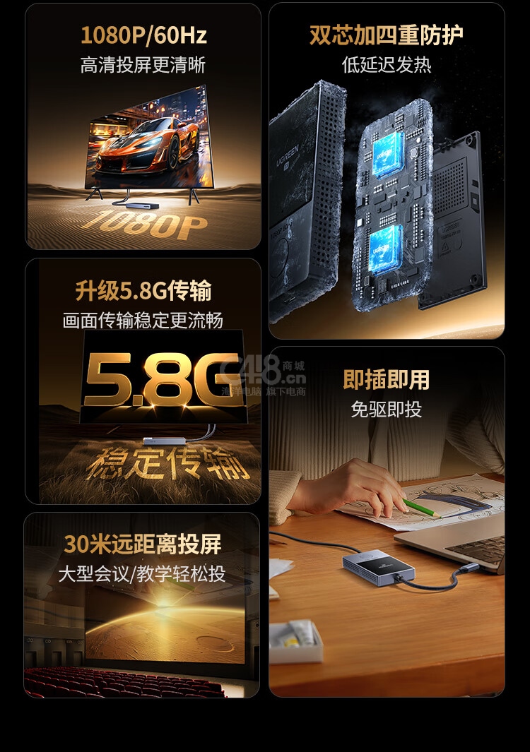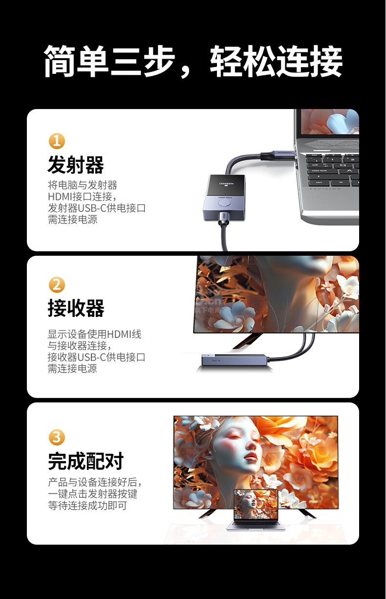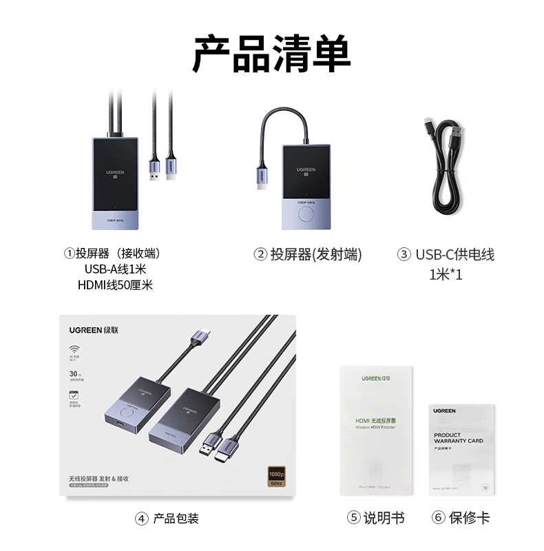 投屏器(發(fā)射+接收)*1 USB供電線1米*1魔術(shù)貼*1扎線帶*1卡針*1