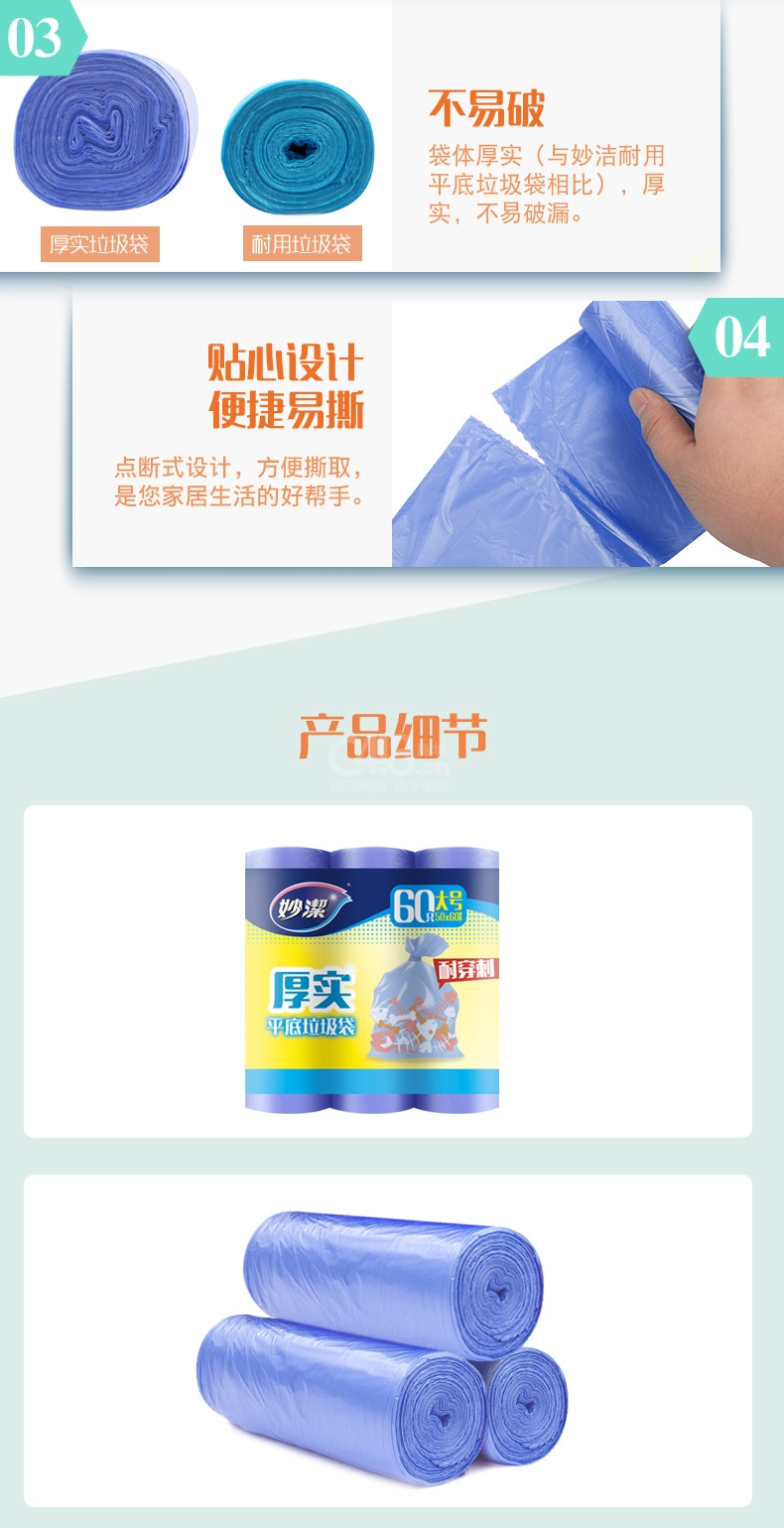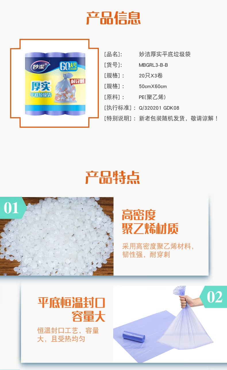 “MIAOJIE/妙潔(妙潔)”MBGRL3-B-B 平底垃圾袋 單卷裝(厚實加厚文明干濕分類新老包裝隨機發(fā)貨3卷/包20只/卷)