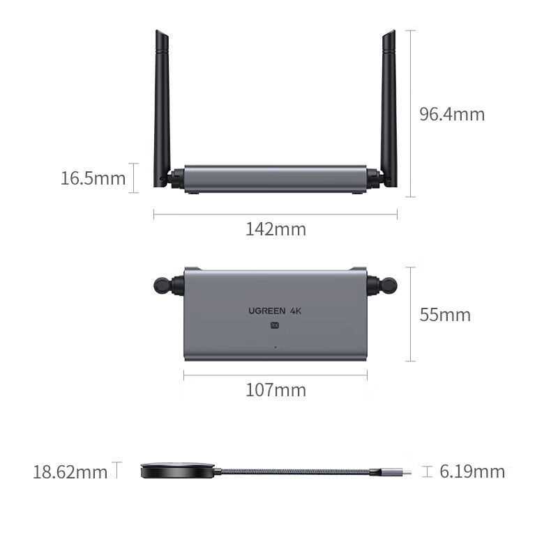 投屏器(接收端+發(fā)射端)*1 產(chǎn)品包裝*1 HDMI線0.5米*1 USB-C供電線1米*2 3.5mm音頻線1米*1 充電頭*2 說(shuō)明書(shū)*1 保修卡*1
