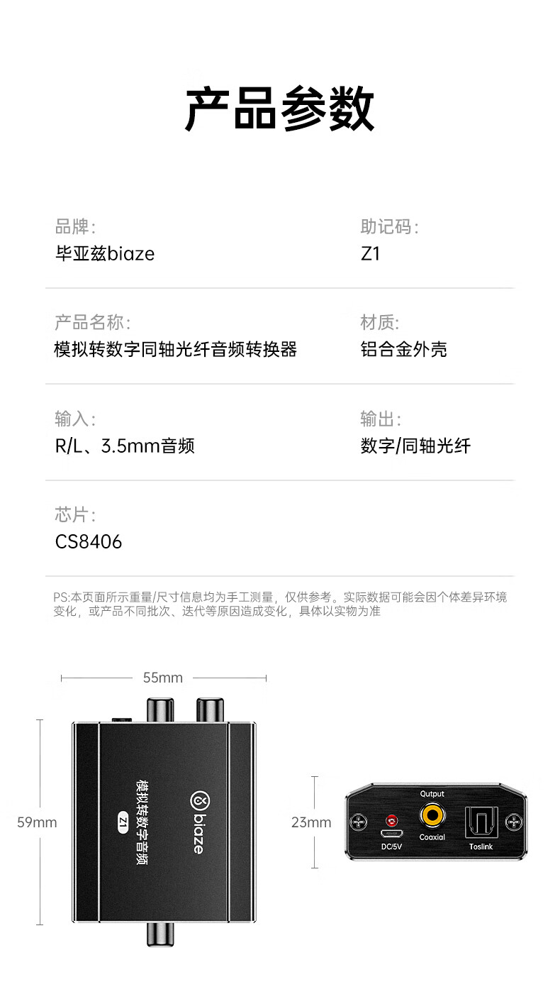 數(shù)字光纖同軸音頻轉(zhuǎn)換器Z1 *1 用戶手冊*1 USB供電線*1 紙盒包裝*1