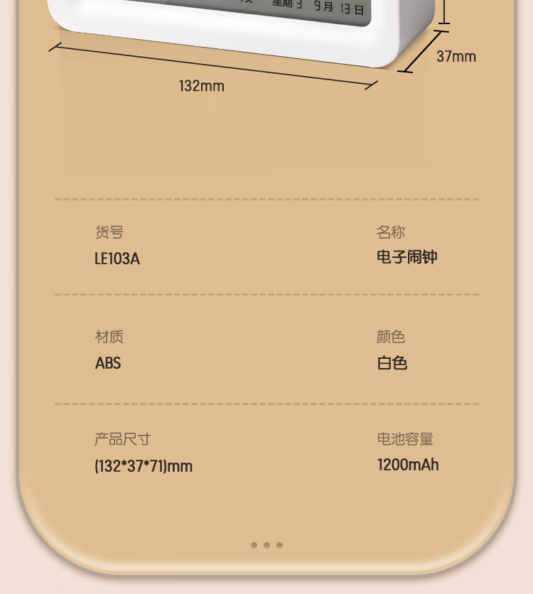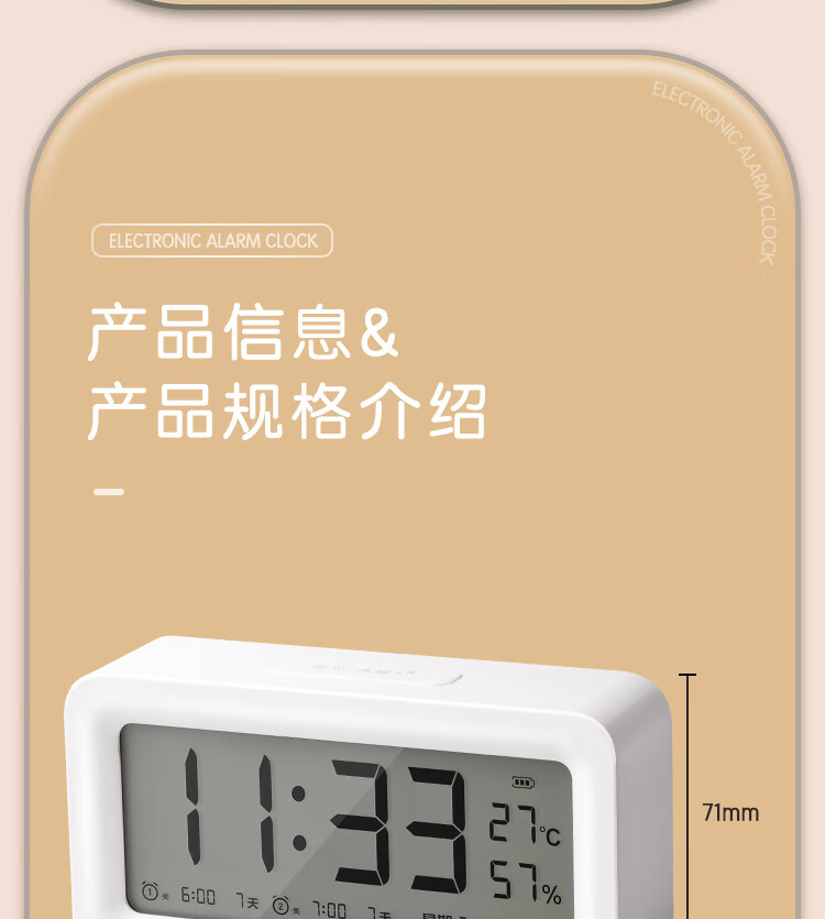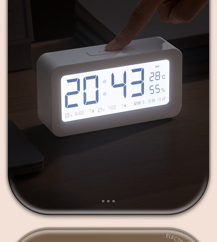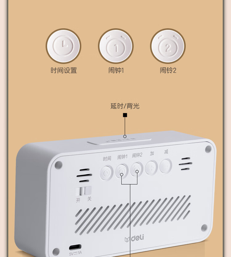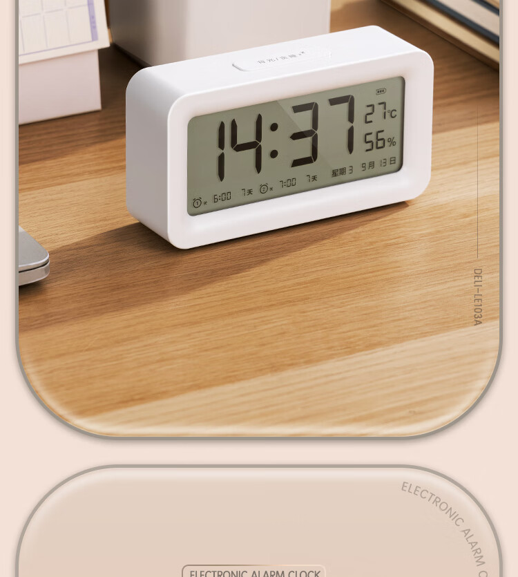 “deli/得力”LE103A 電子鬧鐘 單個裝(白色充電款背光大鬧鈴學生多功能溫濕度計大屏床頭鐘)