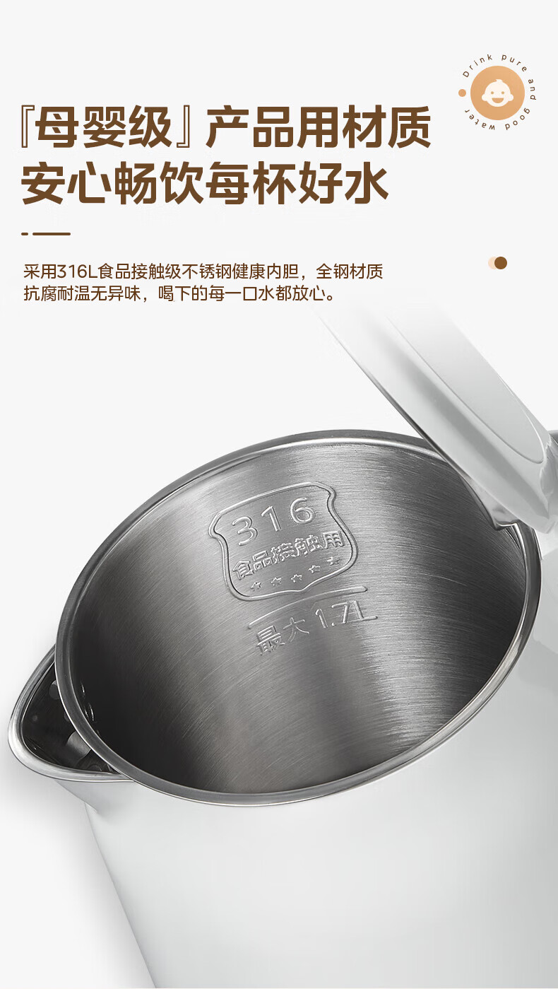 “Midea/美的”SH17M301-PRO 電熱水壺 單個裝(電水壺熱水壺食品級316L不銹鋼雙層防燙燒水壺自動智能斷電)
