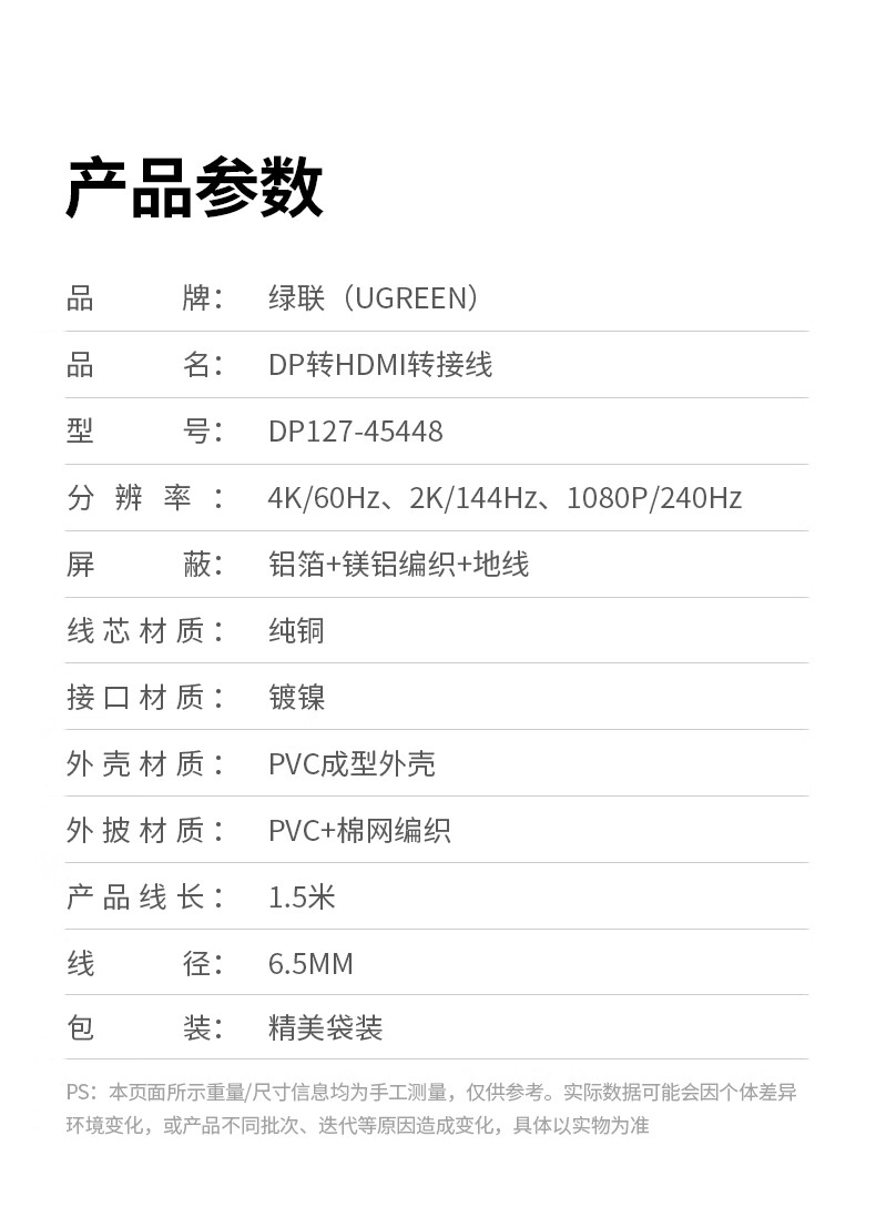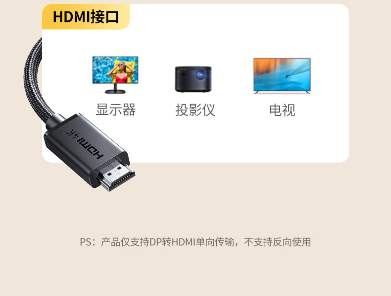 “UGREEN/綠聯(lián)”DP127 45448 DP轉(zhuǎn)HDMI轉(zhuǎn)接線 單條裝(4K60Hz高清連接線DisplayPort轉(zhuǎn)HDMI2.0適用電腦接電視顯示器視頻線1.5米)