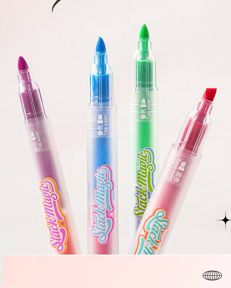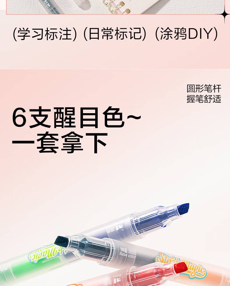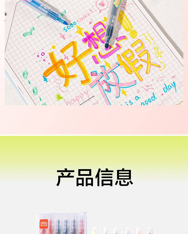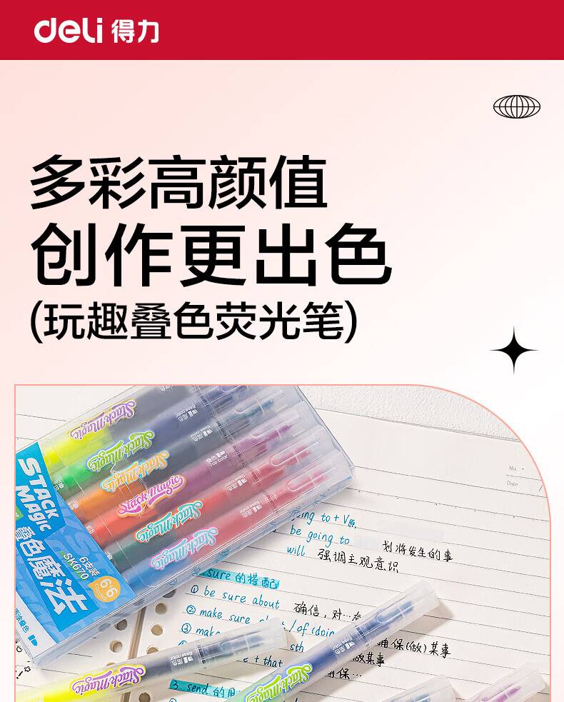 “deli/得力”SK670 雙頭疊色熒光筆 1盒裝(12色6支大容量彩色熒光筆標(biāo)記筆學(xué)生用記號筆劃重點手抄報筆)